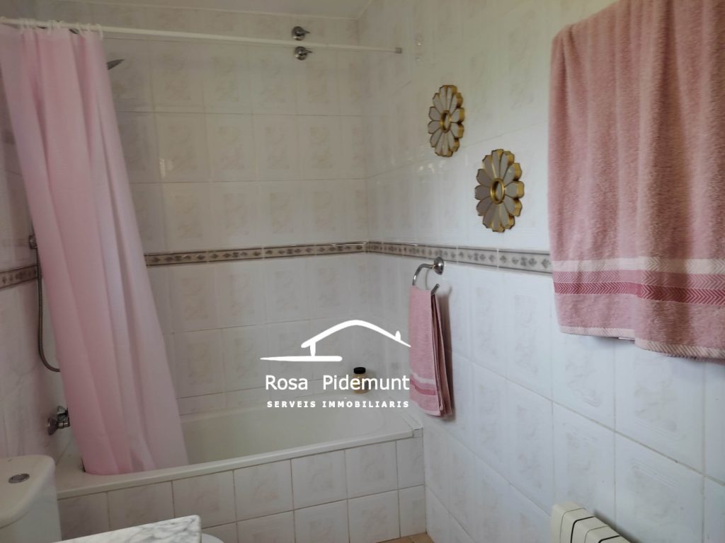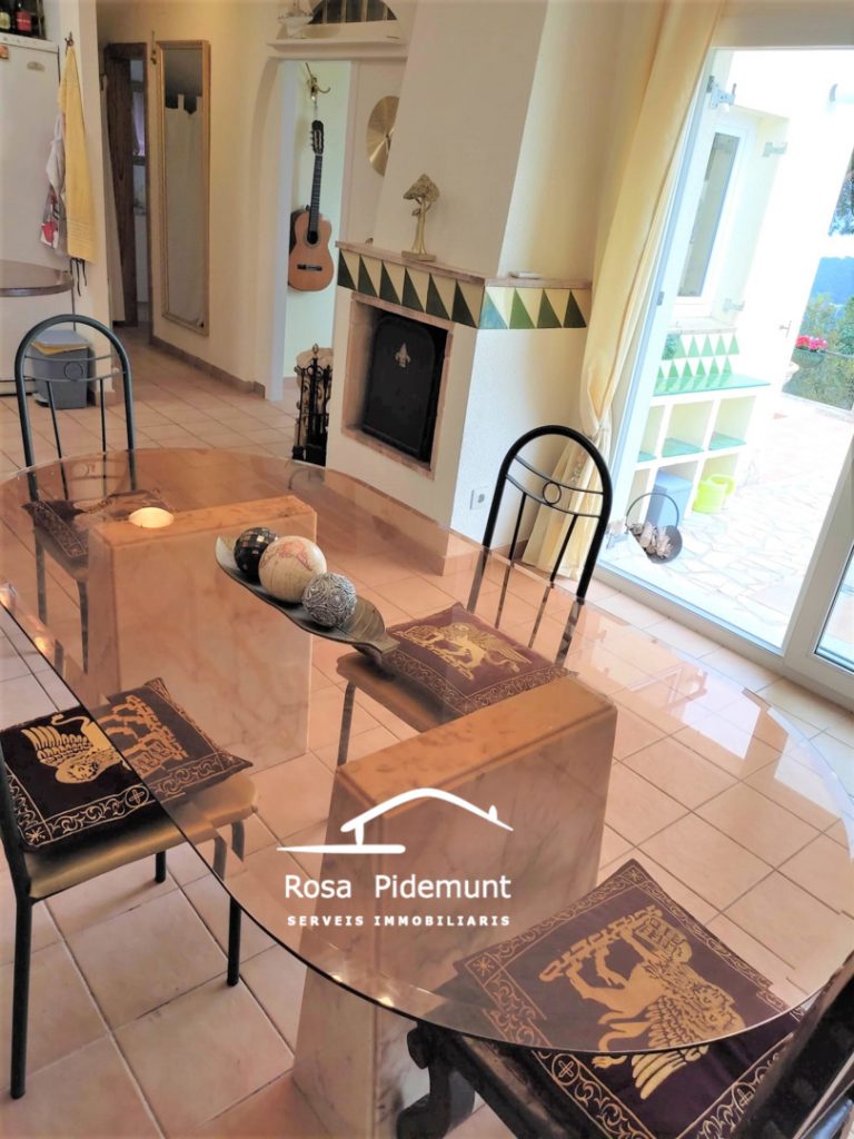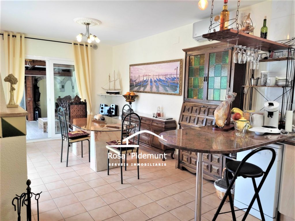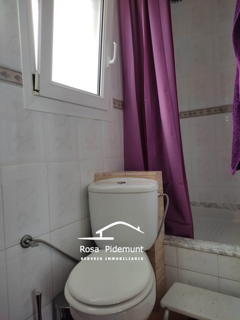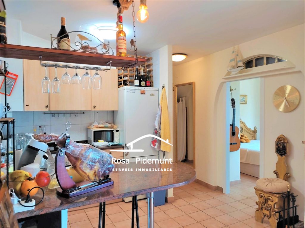 Just hi trobem el menjador amb cuina oberta i llar de foc. Més al fons, una habitació i un bany amb plat de dutxa.