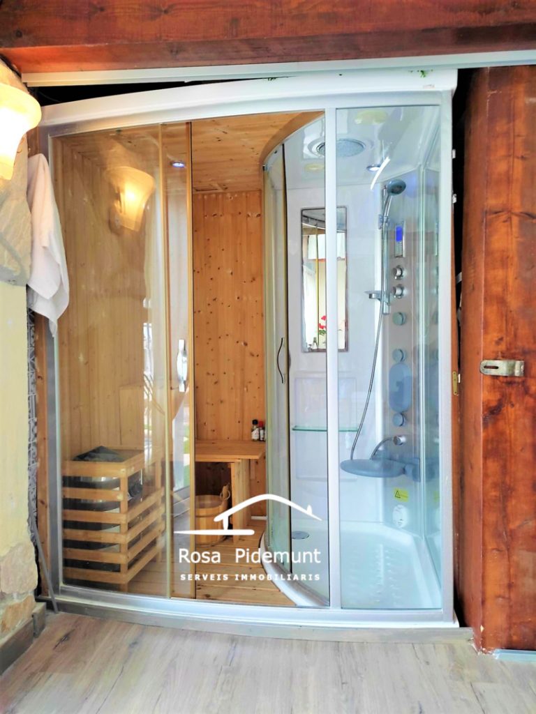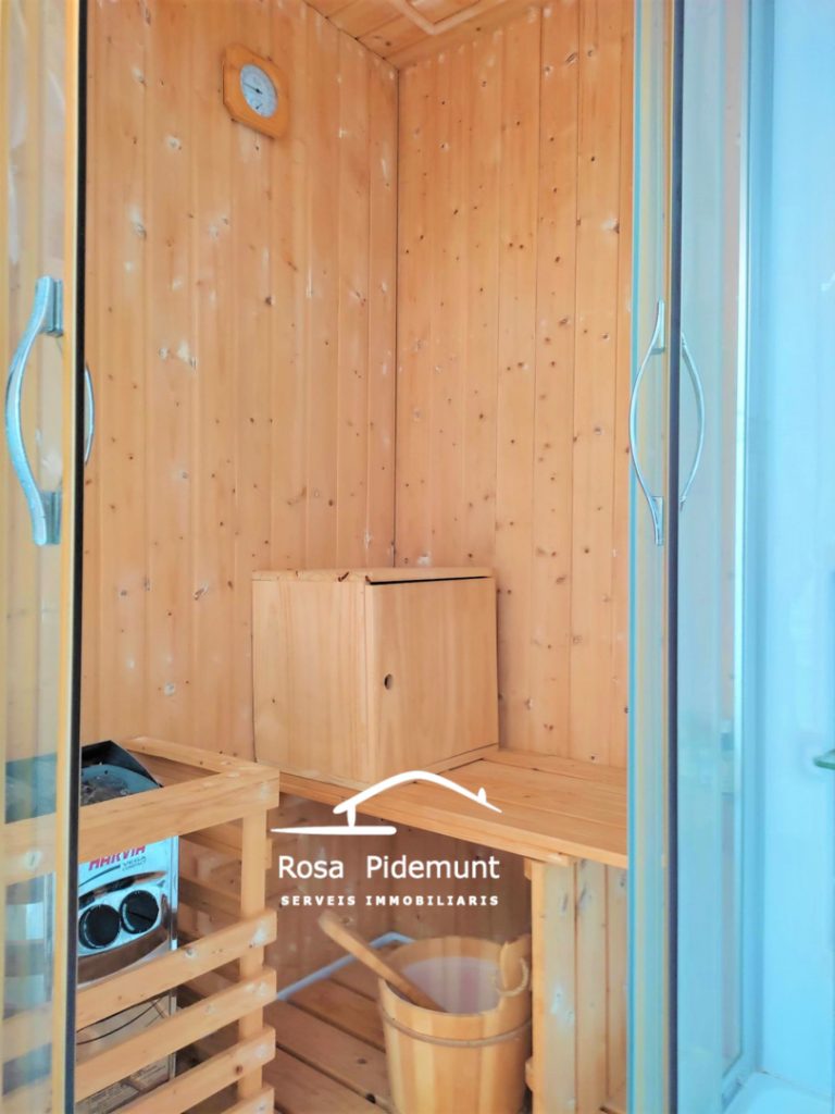 A l’esquerre, just a l’entrada del saló, hi ha una sauna petita finlandesa i una de vapor, quina es pot convertir en dutxa – amb llums – Zona SPA!