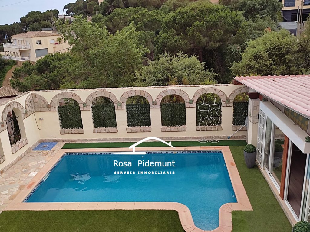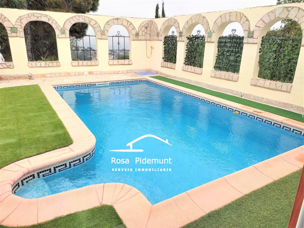 Gran terrassa amb piscina amb arcades i zona lounge i barbacoa.